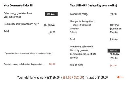A two-bill system involves your usual utility bill and then a separate bill from the community solar provider. The utility bill would reflect your total electricity usage minus the credits (savings) generated by your solar subscription (see below example). The credits reduce your overall utility bill. The subscription solar bill would be sent 1-2 months after your credits have discounted your utility bill by the solar project manager, charging you for the solar credits at a discounted rate compared to standard electricity prices. The type of billing system doesn’t affect the cost savings of the subscription program.